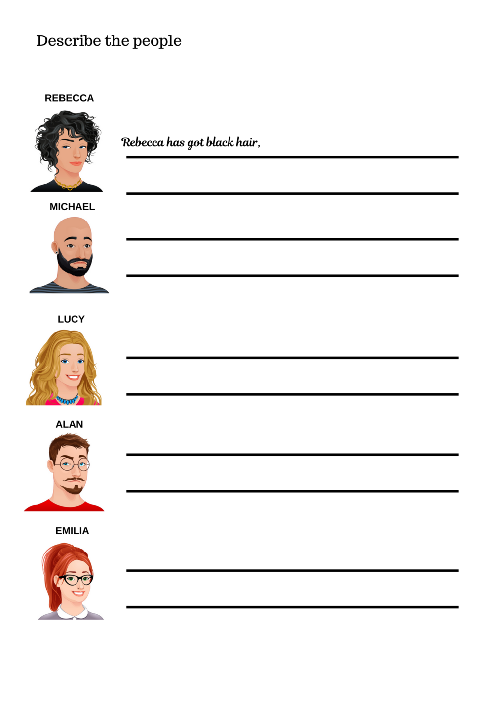 Worksheet that you can use to work description with your students (hair, eyes, beard, glasses).