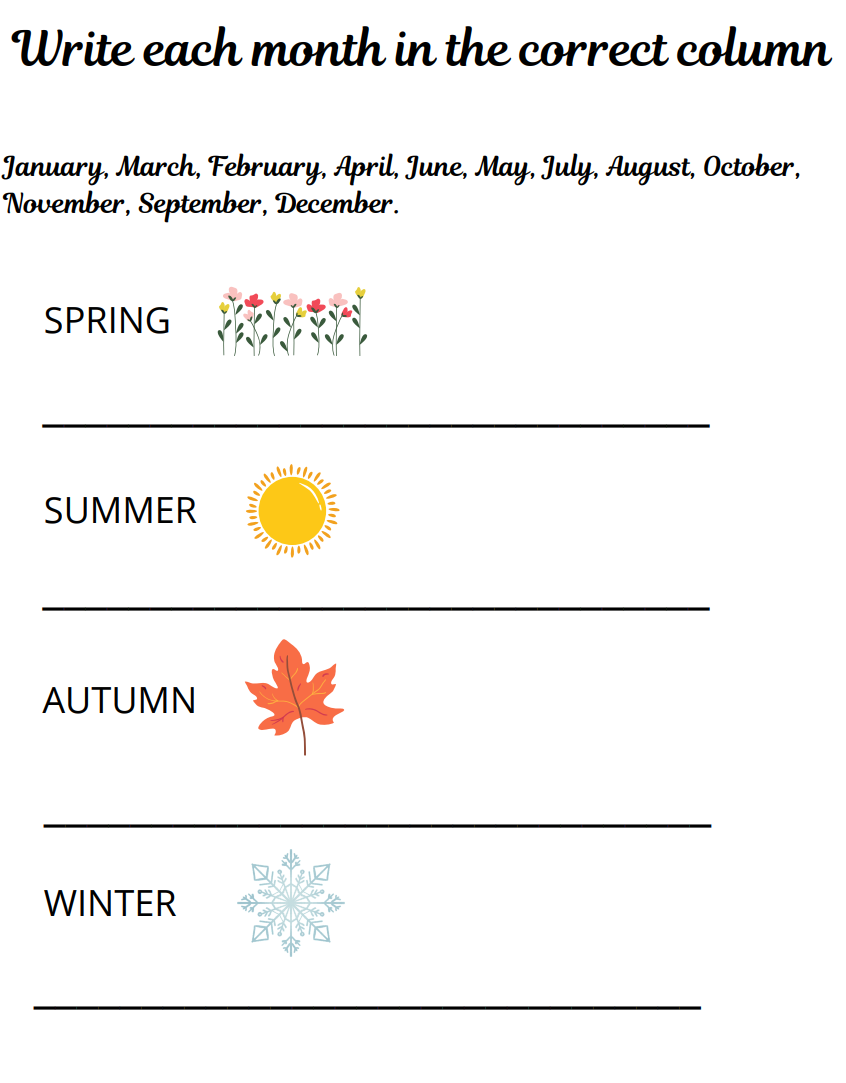 A worksheet for Primary students where they have to write months of the year in the correct column.