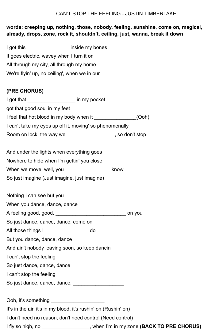 Un PDF de 2 páginas con las lyrics de la canción para completar los huecos / A PDF with 2 pages with a fill in the gaps exercise to complete the song